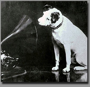 « La Voix de son maître » L'illustration est reprise comme emblème des marques EMI, Pathé-Marconi et RCA.