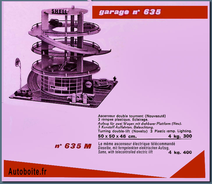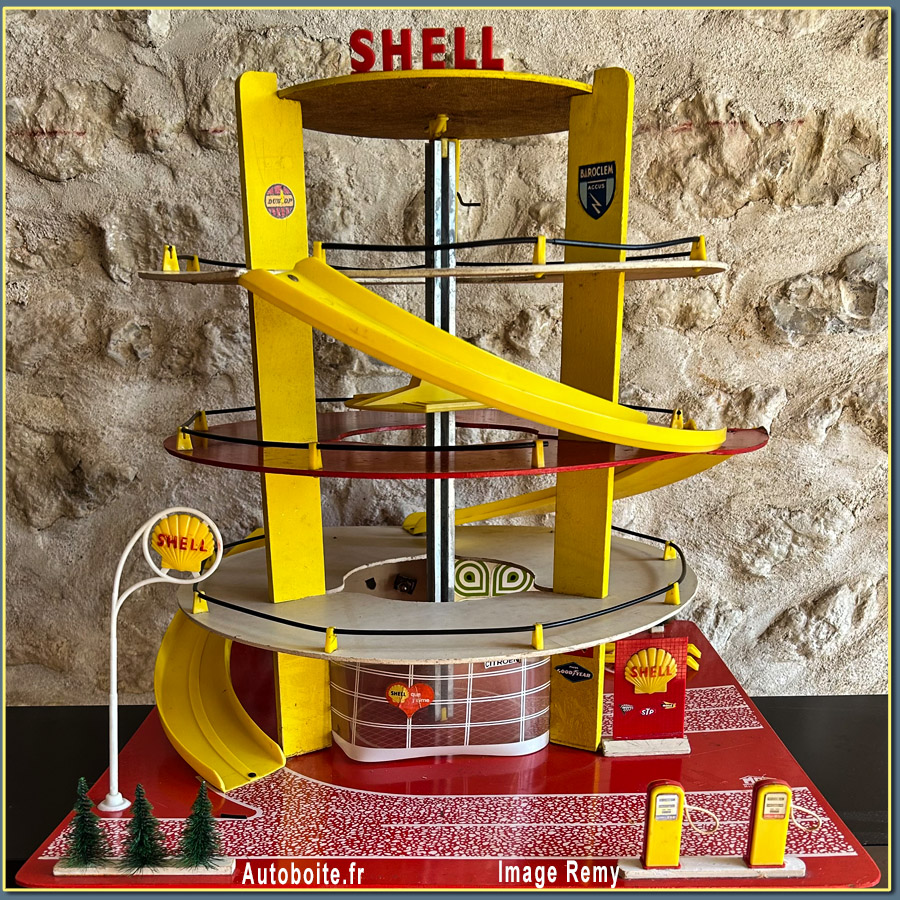 | Bois plastique, métal, 3 étages, pompes, pont de graissage, 3 rampes d'accès aux l'étages, avec ascenseur double tournant, mât et enseigne Shell |