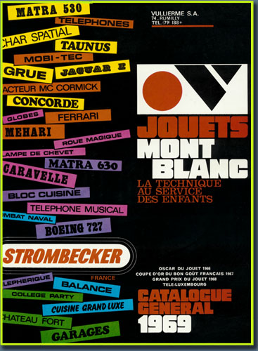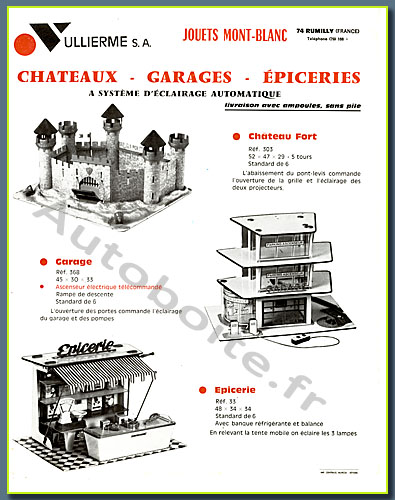 Ce catalogue très complet regroupe la production Mont Blanc de 1969. Cette production est très variée, on y trouve des voitures, des avions et des garages ce sont pratiquement les mêms que sur le feuillet précédent avec quelques modifications (pompes et décorations) mais ce catalogue est en couleur). |