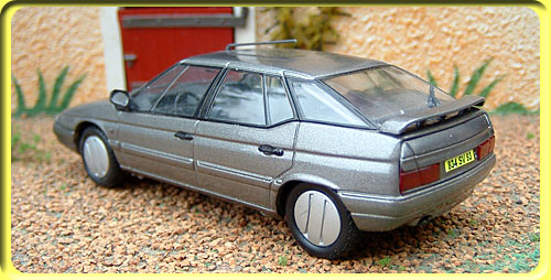 euros avec fascicule et boite carton, est fort bien réalisée. En l'examinant de prés on s'aperçois que Hachette et Norev, se sont un peu embrouillés en ce qui concerne la finition. D'un coté on a un modèle avec la finition haut de gamme: séparation avec une vitre du coffre, parre-chocs peints becquet arrière, alors que les rétros sont noirs et les roues sont celles des finition bas de gamme. On obtient donc un mélange des versions, ceci est trés dommage vu la qualité du modèle. Il faut bien reconnaître que cette série Voitures Françaises offre souvent des modèles médiocres, celle-ci est bien plus belles que la moyenne de cette collection, bien finie dotée d'une ligne irréprochable, il est regretable que les roues aient été mal choisies, cela en fait quand même un excellent modèle d'un rapport qualité prix imbattable. Nota les plaques d'immatriculation ont été ajoutées. |