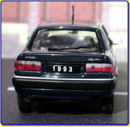 en miniature est à ranger dans la catégorie des réussites. La ligne générale de la miniature est exacte, la fabrication sérieuse, la miniature est garnie de nombreux détails en tampographie l'emblème Citroën sur le capot avant, les inscriptions 2.0I de chaque coté en bas des portières, les inscriptions Citroën et Xantia sur le hayon arrière. Noir mat sur les vitres et parre-brise et sur les contours des portes. Rien ne manque les essui-glaces avant et arrière d'une bonne finesse ainsi que les rétroviseurs. Universal Hobbies a oublié de faire descendre le hayon jusqu'au parre-choc il manque les stries sous la jonction des feux arrières. Ceci n'est pas trop choquant le résultat global est tout à fait positif. |