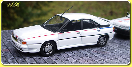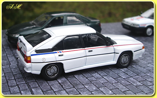 B est assez inconne du grand public, Le moteur de 2141 cc est emprunté aux Peugeot 505 et Chrysler 180 mais retravaillé par ROC pour délivrer 200cv grace à un turbocompresseur. La ligne est alongée et les ailes élargies. La saison ne fut pas une réussite Citroën retira ses BX du championat. La miniature est signée Universal Hobbies c'est une bonne reroduction, version client sans sponseur. |