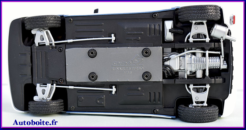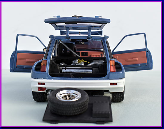 | Après avoir enlevé la tablette arrière avec sa roue de secours (6 roues au total pour cette miniature), on peut apercevoir le v6 turbo |